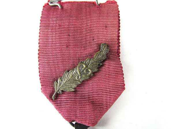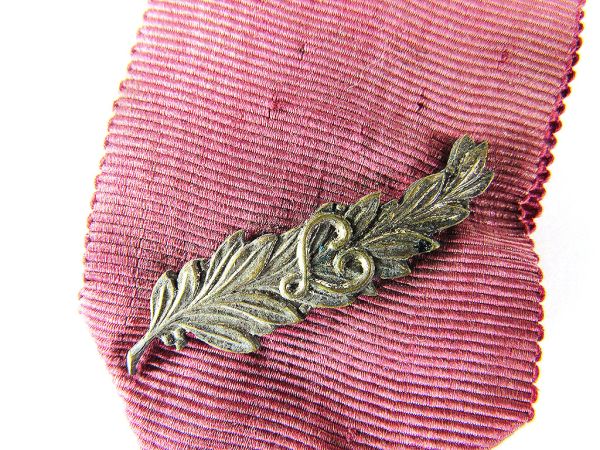 - リボン:無地のマルーン(ワインレッド)色です。ただし、画像には月桂樹の葉を模したピン(ブローチ)が追加されています。